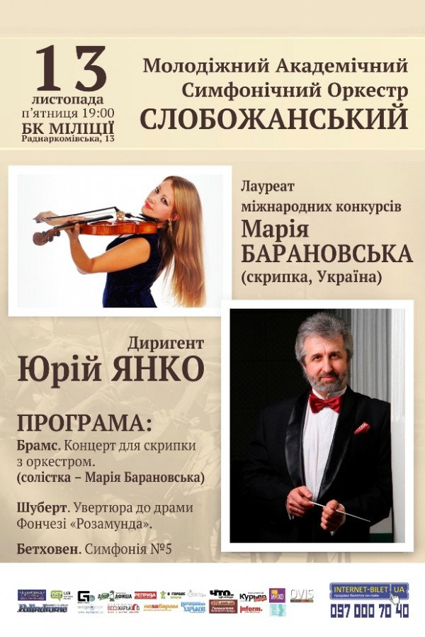 Концерт симфонічної музики. МАСО «Слобожанський» відбудеться 13 листопада 2015, 19:00, п’ятниця в ДК Міліції (Будинок Алчевських). За допомогою сервісу internet-bilet.ua, Ви зможете з легкістю забронювати, замовити та купити квитки на концерт, спектакль, оперу, балет, майстер-класи, спортивні та дитячі заходи, що Вас цікавлять, оплативши їх найбільш зручним для Вас способом: через інтернет банківською карткою VISA/MasterCard, готівкою або кур'єром, якщо зробите замовлення квитка з доставкою.