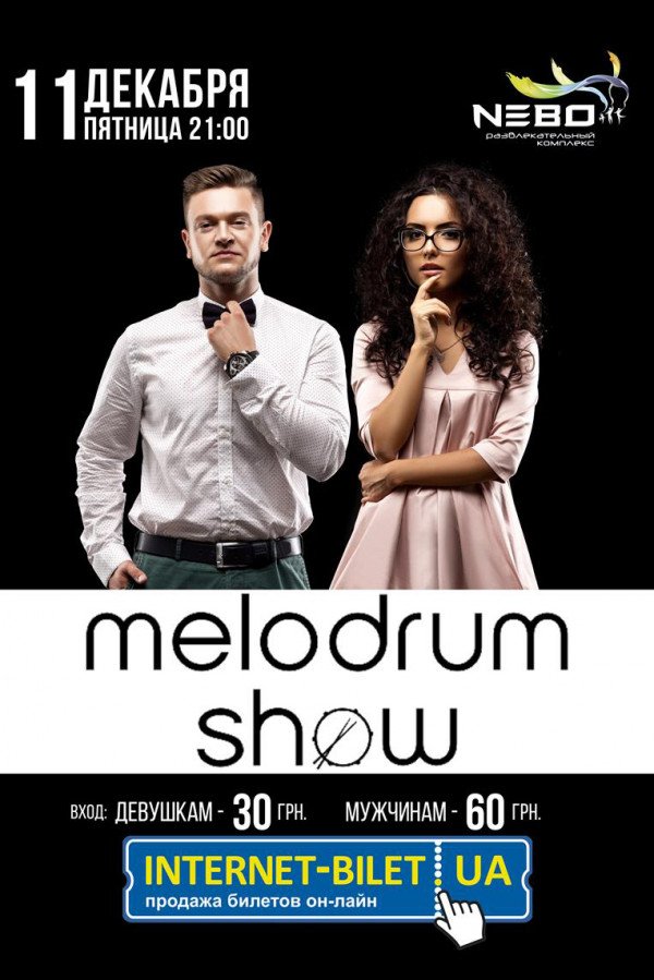 MELODRUM SHOW відбудеться 11 грудня 2015, 21:00, п’ятниця в РК "Небо". За допомогою сервісу internet-bilet.ua, Ви зможете з легкістю забронювати, замовити та купити квитки на концерт, спектакль, оперу, балет, майстер-класи, спортивні та дитячі заходи, що Вас цікавлять, оплативши їх найбільш зручним для Вас способом: через інтернет банківською карткою VISA/MasterCard, готівкою або кур'єром, якщо зробите замовлення квитка з доставкою.