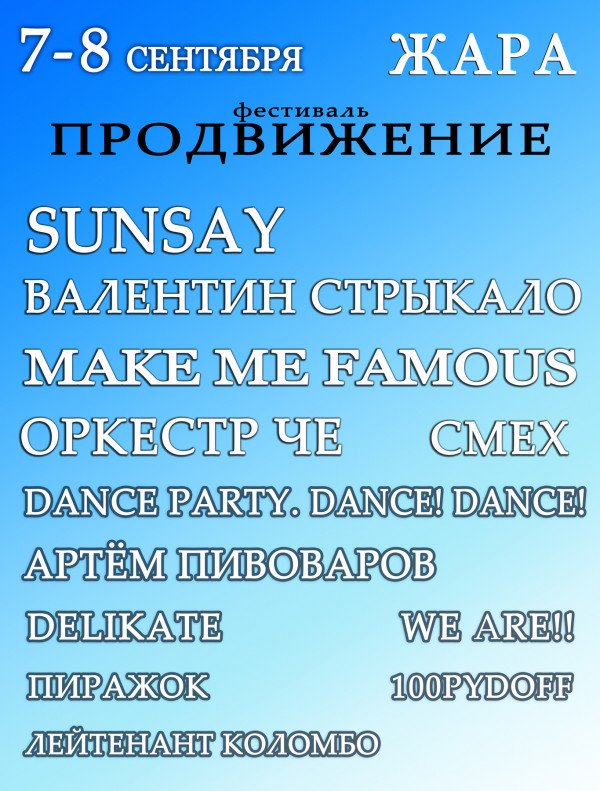 Фестиваль ПРОДВИЖЕНИЕ - SUNSAY, ВАЛЕНТИН СТРЫКАЛО, ОРКЕСТР ЧЕ, MAKE ME FAMOUS и другие... 7-8 сентября