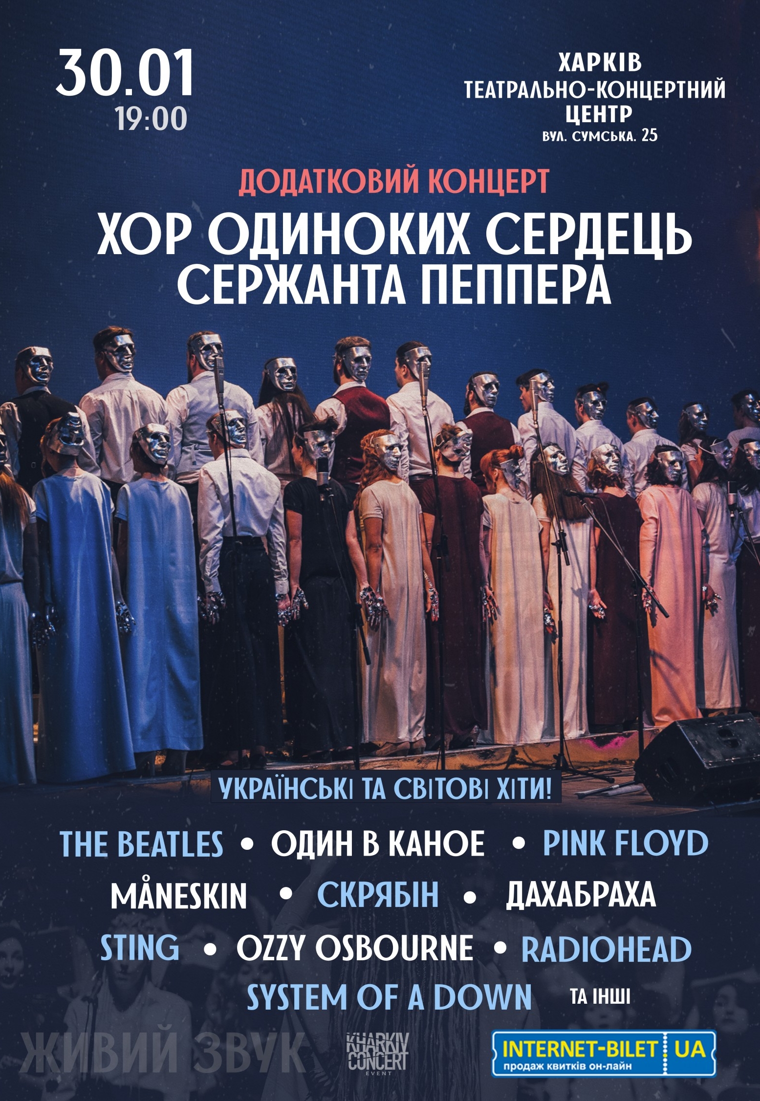 Хор Одиноких Сердець Сержанта Пеппера відбудеться 30 січня 2026, 19:00, п’ятниця в ТЕАТРАЛЬНО-КОНЦЕРТНИЙ ЦЕНТР. За допомогою сервісу internet-bilet.ua, Ви зможете з легкістю забронювати, замовити та купити квитки на концерт, спектакль, оперу, балет, майстер-класи, спортивні та дитячі заходи, що Вас цікавлять, оплативши їх найбільш зручним для Вас способом: через інтернет банківською карткою VISA/MasterCard, готівкою або кур'єром, якщо зробите замовлення квитка з доставкою.