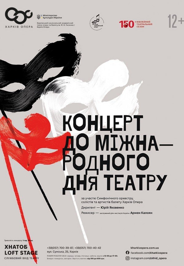 Концерт до Міжнародного дня театру відбудеться 27 березня 2026, 17:00, п’ятниця в ХНАТОБ LOFT STAGE. За допомогою сервісу internet-bilet.ua, Ви зможете з легкістю забронювати, замовити та купити квитки на концерт, спектакль, оперу, балет, майстер-класи, спортивні та дитячі заходи, що Вас цікавлять, оплативши їх найбільш зручним для Вас способом: через інтернет банківською карткою VISA/MasterCard, готівкою або кур'єром, якщо зробите замовлення квитка з доставкою.