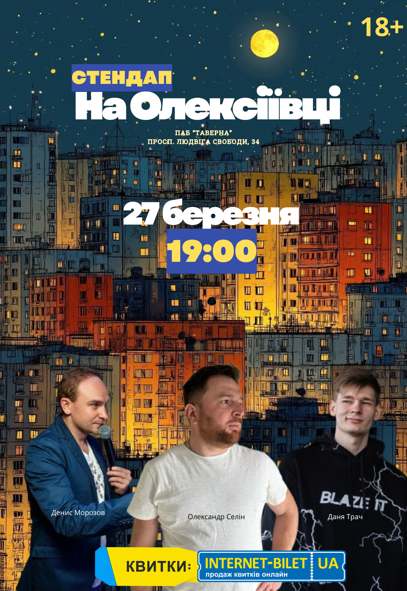 Стендап на Олексіївці відбудеться 27 березня 2026, 19:00, п’ятниця в Паб "Таверна". За допомогою сервісу internet-bilet.ua, Ви зможете з легкістю забронювати, замовити та купити квитки на концерт, спектакль, оперу, балет, майстер-класи, спортивні та дитячі заходи, що Вас цікавлять, оплативши їх найбільш зручним для Вас способом: через інтернет банківською карткою VISA/MasterCard, готівкою або кур'єром, якщо зробите замовлення квитка з доставкою.