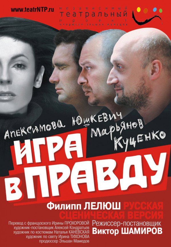 Игра в правду відбудеться 6 листопада 2012, 19:30, вівторок в ХНАТОБ. За допомогою сервісу internet-bilet.ua, Ви зможете з легкістю забронювати, замовити та купити квитки на концерт, спектакль, оперу, балет, майстер-класи, спортивні та дитячі заходи, що Вас цікавлять, оплативши їх найбільш зручним для Вас способом: через інтернет банківською карткою VISA/MasterCard, готівкою або кур'єром, якщо зробите замовлення квитка з доставкою.