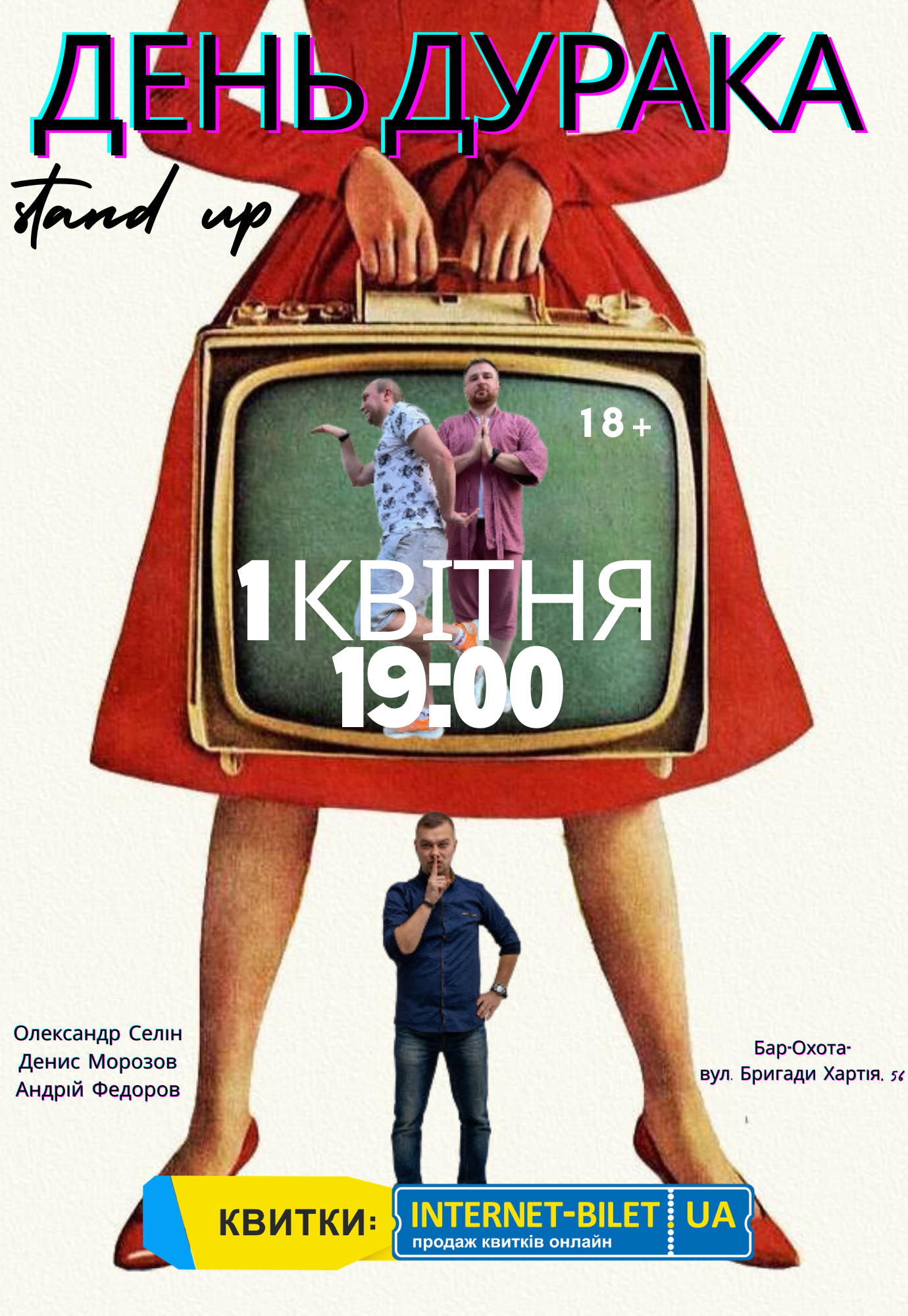 Stand Up "День Дурака" відбудеться 1 квітня 2026, 19:00, середа в Караоке бар "Охота". За допомогою сервісу internet-bilet.ua, Ви зможете з легкістю забронювати, замовити та купити квитки на концерт, спектакль, оперу, балет, майстер-класи, спортивні та дитячі заходи, що Вас цікавлять, оплативши їх найбільш зручним для Вас способом: через інтернет банківською карткою VISA/MasterCard, готівкою або кур'єром, якщо зробите замовлення квитка з доставкою.