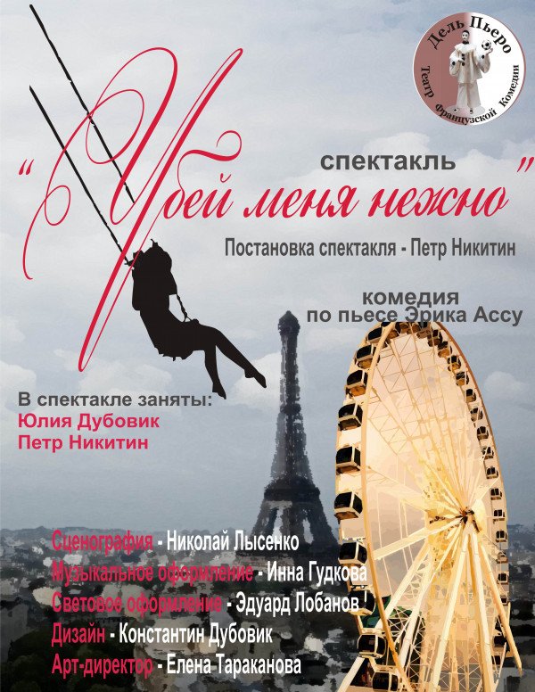 Убей меня нежно! відбудеться 23 вересня 2012, 19:00, неділя в Будинок Актора. За допомогою сервісу internet-bilet.ua, Ви зможете з легкістю забронювати, замовити та купити квитки на концерт, спектакль, оперу, балет, майстер-класи, спортивні та дитячі заходи, що Вас цікавлять, оплативши їх найбільш зручним для Вас способом: через інтернет банківською карткою VISA/MasterCard, готівкою або кур'єром, якщо зробите замовлення квитка з доставкою.