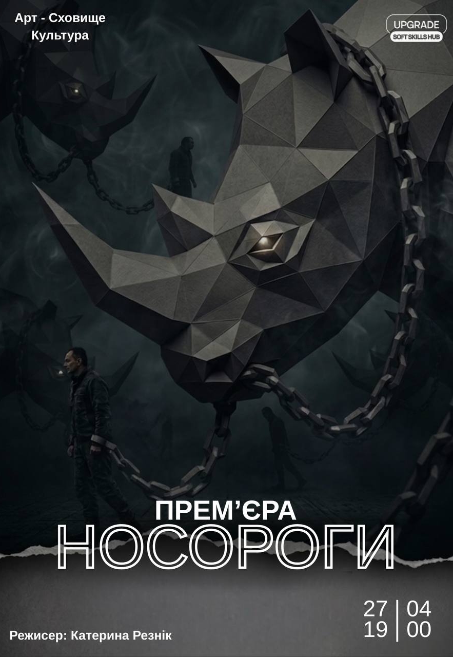 Вистава "Носороги". Прем'єра! відбудеться 27 квітня 2026, 19:00, понеділок в Арт-Сховище Культура. За допомогою сервісу internet-bilet.ua, Ви зможете з легкістю забронювати, замовити та купити квитки на концерт, спектакль, оперу, балет, майстер-класи, спортивні та дитячі заходи, що Вас цікавлять, оплативши їх найбільш зручним для Вас способом: через інтернет банківською карткою VISA/MasterCard, готівкою або кур'єром, якщо зробите замовлення квитка з доставкою.
