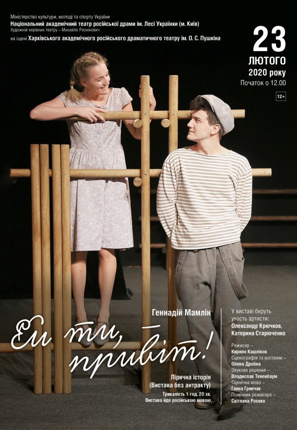 Вистава "Ей ти, - привіт!" відбудеться 23 лютого 2020, 12:00, неділя в Харківський академічний драматичний театр (велика зала). За допомогою сервісу internet-bilet.ua, Ви зможете з легкістю забронювати, замовити та купити квитки на концерт, спектакль, оперу, балет, майстер-класи, спортивні та дитячі заходи, що Вас цікавлять, оплативши їх найбільш зручним для Вас способом: через інтернет банківською карткою VISA/MasterCard, готівкою або кур'єром, якщо зробите замовлення квитка з доставкою.