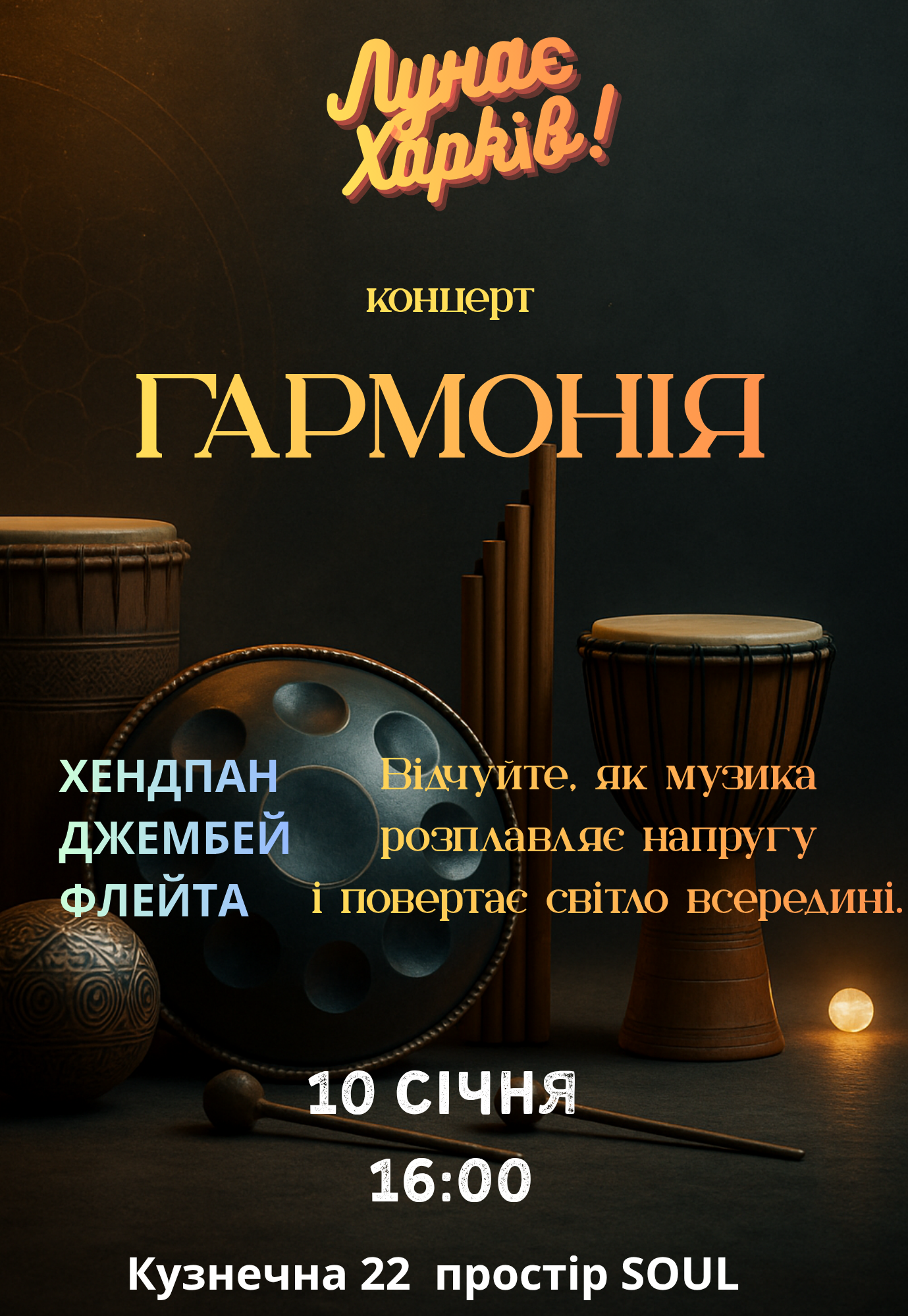 Концерт "Гармонія" відбудеться 10 січня 2026, 16:00, субота в Простір Співаючих Тибетських Чаш. За допомогою сервісу internet-bilet.ua, Ви зможете з легкістю забронювати, замовити та купити квитки на концерт, спектакль, оперу, балет, майстер-класи, спортивні та дитячі заходи, що Вас цікавлять, оплативши їх найбільш зручним для Вас способом: через інтернет банківською карткою VISA/MasterCard, готівкою або кур'єром, якщо зробите замовлення квитка з доставкою.