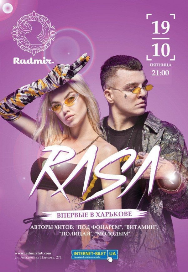 Група «RASA» відбудеться 19 жовтня 2018, 21:00, п’ятниця в Radmir Club. За допомогою сервісу internet-bilet.ua, Ви зможете з легкістю забронювати, замовити та купити квитки на концерт, спектакль, оперу, балет, майстер-класи, спортивні та дитячі заходи, що Вас цікавлять, оплативши їх найбільш зручним для Вас способом: через інтернет банківською карткою VISA/MasterCard, готівкою або кур'єром, якщо зробите замовлення квитка з доставкою.