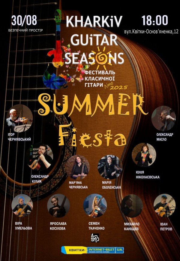 KHARKIV GUITAR SEASONS: SUMMER FIESTA відбудеться 30 серпня 2025, 18:00, субота в A-SHO. За допомогою сервісу internet-bilet.ua, Ви зможете з легкістю забронювати, замовити та купити квитки на концерт, спектакль, оперу, балет, майстер-класи, спортивні та дитячі заходи, що Вас цікавлять, оплативши їх найбільш зручним для Вас способом: через інтернет банківською карткою VISA/MasterCard, готівкою або кур'єром, якщо зробите замовлення квитка з доставкою.