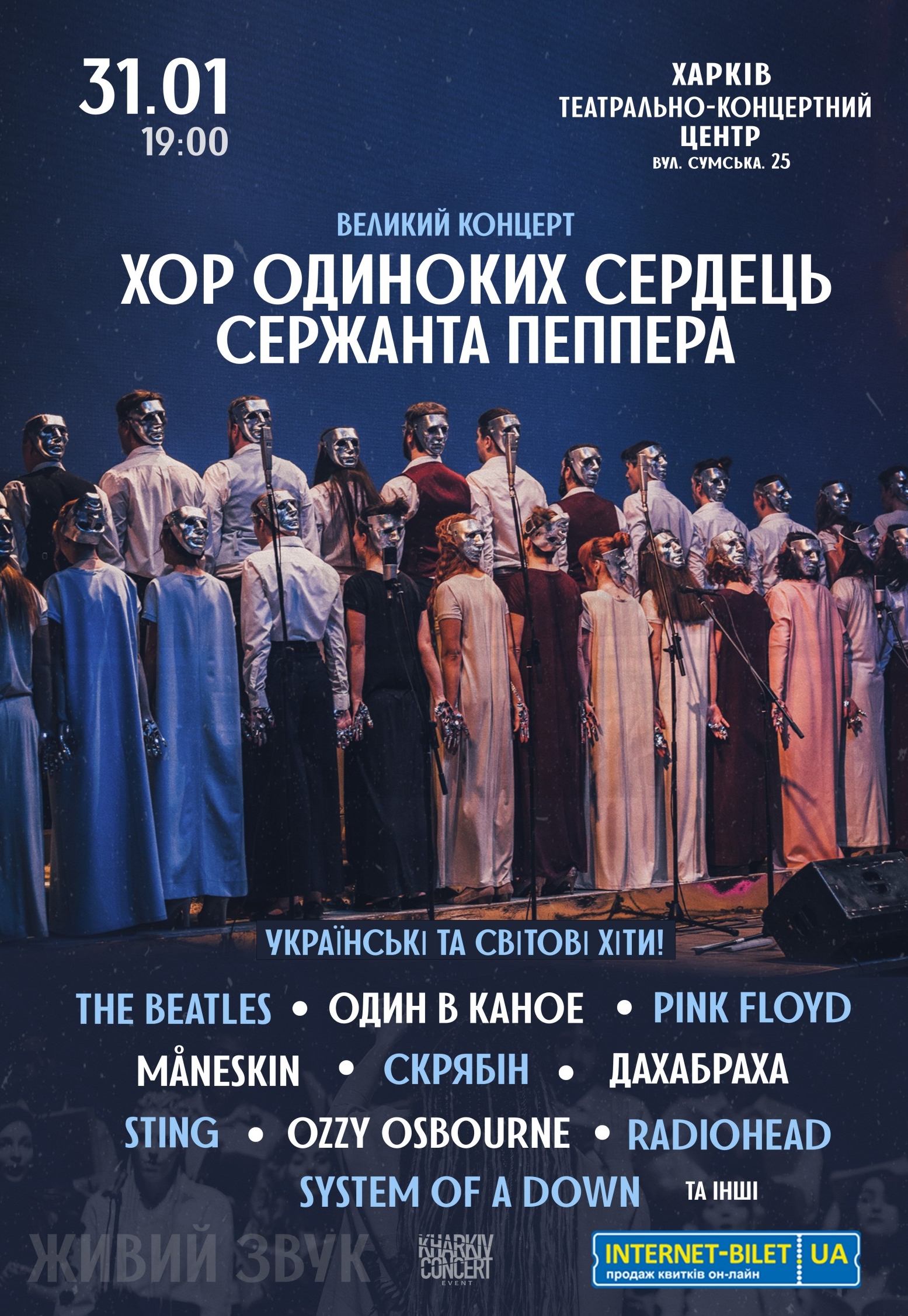 Хор Одиноких Сердець Сержанта Пеппера відбудеться 31 січня 2026, 19:00, субота в ТЕАТРАЛЬНО-КОНЦЕРТНИЙ ЦЕНТР. За допомогою сервісу internet-bilet.ua, Ви зможете з легкістю забронювати, замовити та купити квитки на концерт, спектакль, оперу, балет, майстер-класи, спортивні та дитячі заходи, що Вас цікавлять, оплативши їх найбільш зручним для Вас способом: через інтернет банківською карткою VISA/MasterCard, готівкою або кур'єром, якщо зробите замовлення квитка з доставкою.