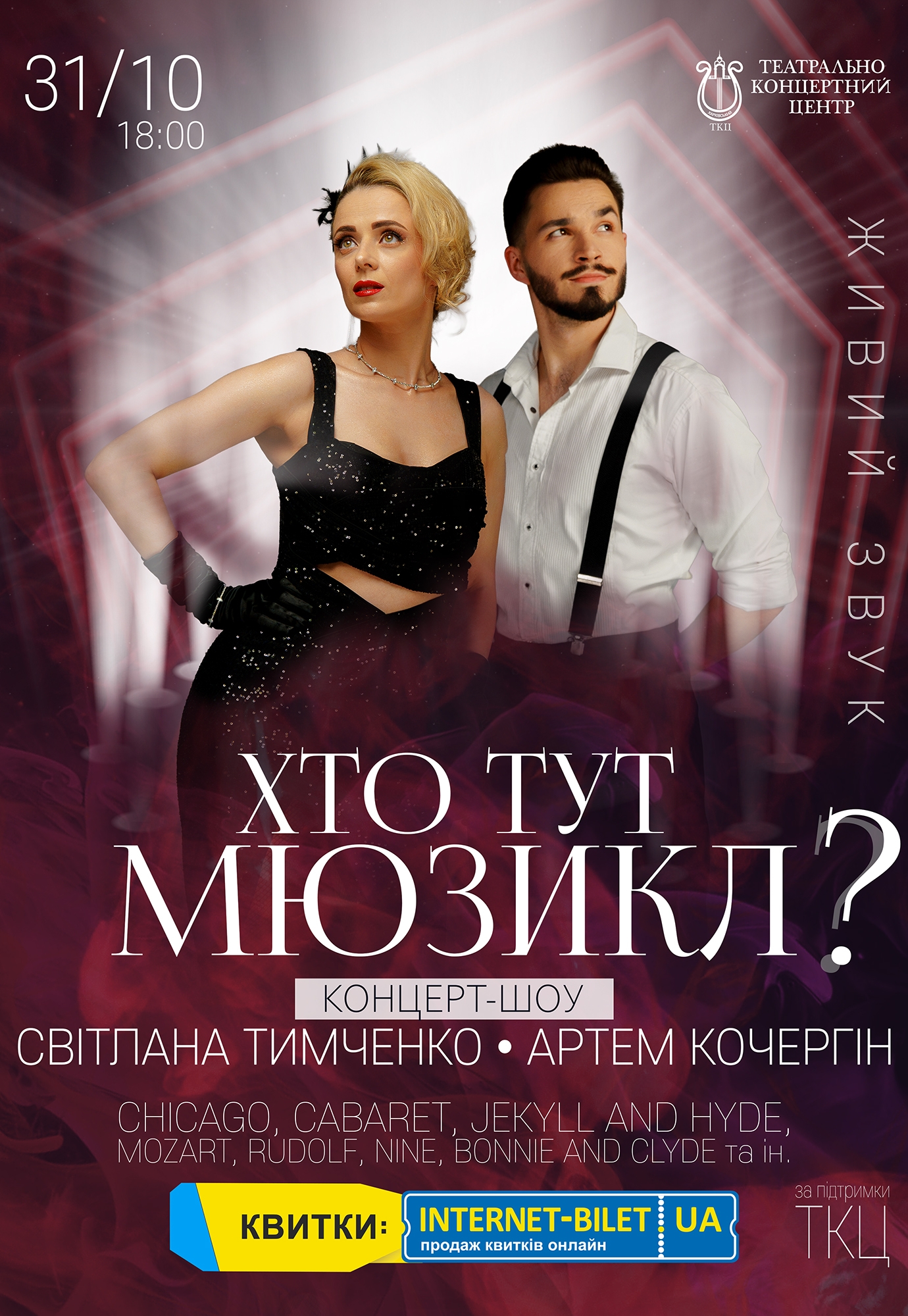 Концерт-шоу "Хто тут Мюзикл?" відбудеться 31 жовтня 2025, 18:00, п’ятниця в ТЕАТРАЛЬНО-КОНЦЕРТНИЙ ЦЕНТР. За допомогою сервісу internet-bilet.ua, Ви зможете з легкістю забронювати, замовити та купити квитки на концерт, спектакль, оперу, балет, майстер-класи, спортивні та дитячі заходи, що Вас цікавлять, оплативши їх найбільш зручним для Вас способом: через інтернет банківською карткою VISA/MasterCard, готівкою або кур'єром, якщо зробите замовлення квитка з доставкою.