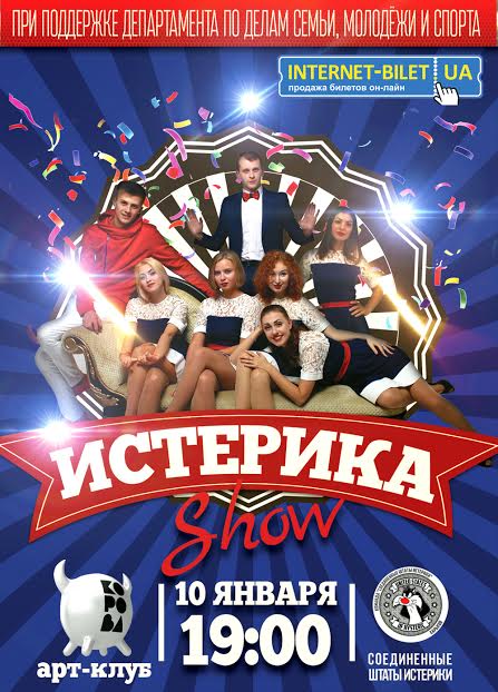 Истерика Show відбудеться 10 січня 2016, 19:00, неділя в Клуб "Корова". За допомогою сервісу internet-bilet.ua, Ви зможете з легкістю забронювати, замовити та купити квитки на концерт, спектакль, оперу, балет, майстер-класи, спортивні та дитячі заходи, що Вас цікавлять, оплативши їх найбільш зручним для Вас способом: через інтернет банківською карткою VISA/MasterCard, готівкою або кур'єром, якщо зробите замовлення квитка з доставкою.