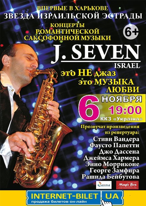 J. Seven відбудеться 6 листопада 2015, 19:00, п’ятниця в ККЗ "Україна". За допомогою сервісу internet-bilet.ua, Ви зможете з легкістю забронювати, замовити та купити квитки на концерт, спектакль, оперу, балет, майстер-класи, спортивні та дитячі заходи, що Вас цікавлять, оплативши їх найбільш зручним для Вас способом: через інтернет банківською карткою VISA/MasterCard, готівкою або кур'єром, якщо зробите замовлення квитка з доставкою.