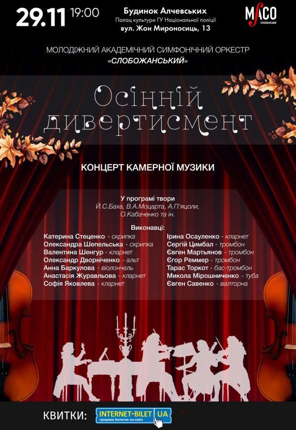 Запрошуємо вас поринути в атмосферу затишного вечора в теплій компанії оркестрантів молодіжного академічного симфонічного оркестру «Слобожанський» на концерті камерної музики «Осінній дивертисмент».