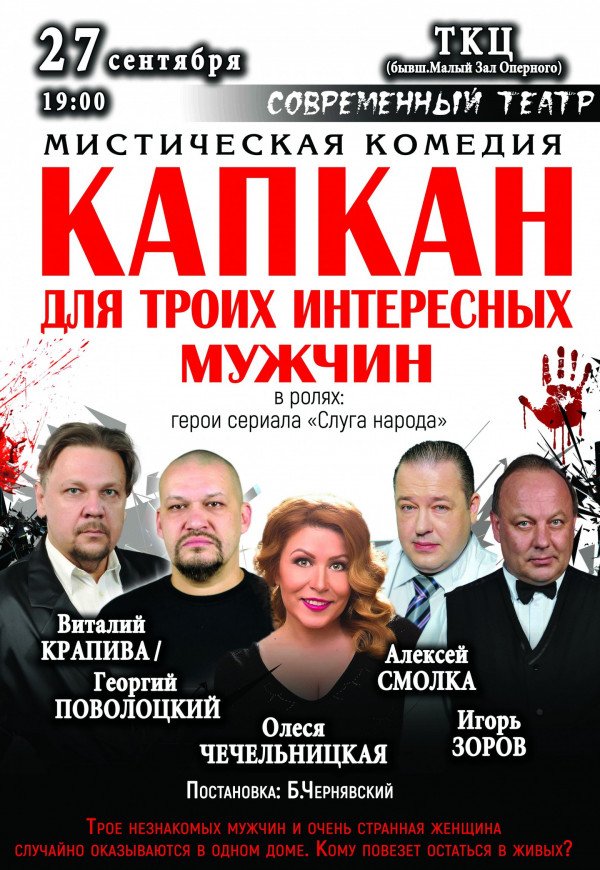Спектакль "Капкан для троих интересных мужчин" відбудеться 27 вересня 2017, 19:00, середа в ТЕАТРАЛЬНО-КОНЦЕРТНИЙ ЦЕНТР. За допомогою сервісу internet-bilet.ua, Ви зможете з легкістю забронювати, замовити та купити квитки на концерт, спектакль, оперу, балет, майстер-класи, спортивні та дитячі заходи, що Вас цікавлять, оплативши їх найбільш зручним для Вас способом: через інтернет банківською карткою VISA/MasterCard, готівкою або кур'єром, якщо зробите замовлення квитка з доставкою.