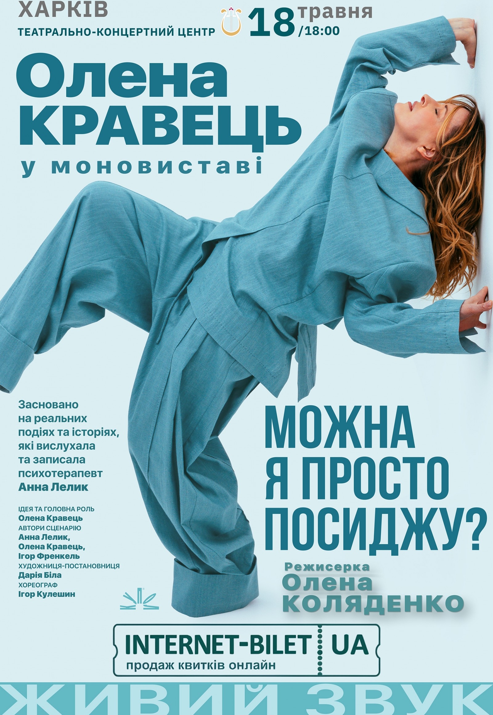 Олена Кравець. Моновистава "Можна я просто посиджу?" відбудеться 18 травня 2026, 18:00, понеділок в ТЕАТРАЛЬНО-КОНЦЕРТНИЙ ЦЕНТР. За допомогою сервісу internet-bilet.ua, Ви зможете з легкістю забронювати, замовити та купити квитки на концерт, спектакль, оперу, балет, майстер-класи, спортивні та дитячі заходи, що Вас цікавлять, оплативши їх найбільш зручним для Вас способом: через інтернет банківською карткою VISA/MasterCard, готівкою або кур'єром, якщо зробите замовлення квитка з доставкою.