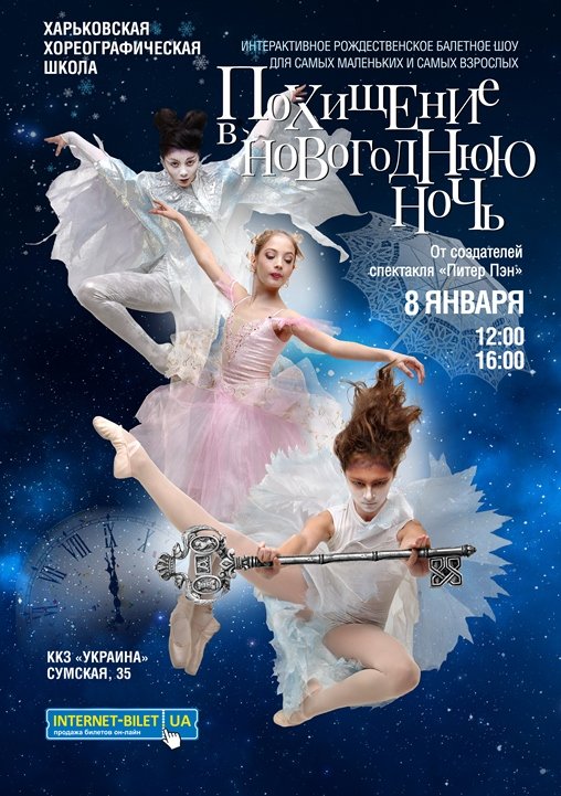 Похищение в новогоднюю ночь відбудеться 8 січня 2016, 16:00, п’ятниця в ККЗ "Україна". За допомогою сервісу internet-bilet.ua, Ви зможете з легкістю забронювати, замовити та купити квитки на концерт, спектакль, оперу, балет, майстер-класи, спортивні та дитячі заходи, що Вас цікавлять, оплативши їх найбільш зручним для Вас способом: через інтернет банківською карткою VISA/MasterCard, готівкою або кур'єром, якщо зробите замовлення квитка з доставкою.