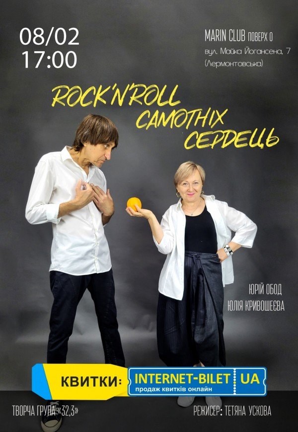 Вистава "Рок-н-ролл самотніх сердець" відбудеться 8 лютого 2026, 17:00, неділя в Marin Club. За допомогою сервісу internet-bilet.ua, Ви зможете з легкістю забронювати, замовити та купити квитки на концерт, спектакль, оперу, балет, майстер-класи, спортивні та дитячі заходи, що Вас цікавлять, оплативши їх найбільш зручним для Вас способом: через інтернет банківською карткою VISA/MasterCard, готівкою або кур'єром, якщо зробите замовлення квитка з доставкою.