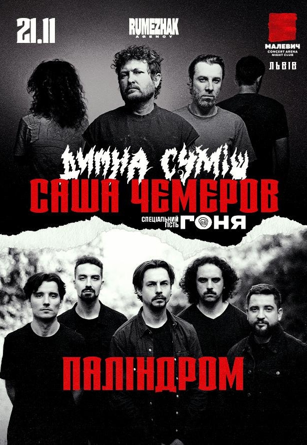 Чемеров і Паліндром — це зіткнення двох світів, енергії й сенсу, бунту й поезії. Дві стихії - рок+реп в серії спліт-концертів в чотирьох містах України.