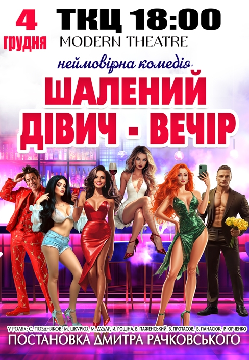 Вистава "Шалений дівич-вечір" відбудеться 4 грудня 2025, 18:00, четвер в ТЕАТРАЛЬНО-КОНЦЕРТНИЙ ЦЕНТР. За допомогою сервісу internet-bilet.ua, Ви зможете з легкістю забронювати, замовити та купити квитки на концерт, спектакль, оперу, балет, майстер-класи, спортивні та дитячі заходи, що Вас цікавлять, оплативши їх найбільш зручним для Вас способом: через інтернет банківською карткою VISA/MasterCard, готівкою або кур'єром, якщо зробите замовлення квитка з доставкою.