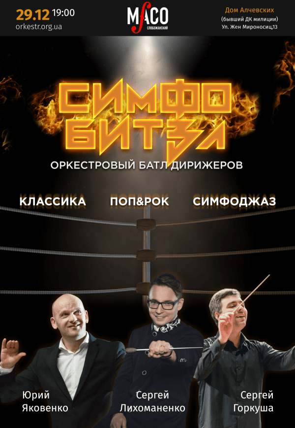 У суботу, 29 грудня, вперше в Харкові! Новорічний музичний сюрприз від МАСО «Слобожанський»! Музика різних стилів і напрямків - класика і рок, Симфо-поп та симфо-джаз в одному концерті! Музика, яка захоплюються мільйони і яка нікого не залишає байдужими! Від старовинних класичних шедеврів до свіжих світових хітів у виконанні справжнього звукового дива - великого симфонічного оркестру! Все це в грандіозному багатожанровому музичному проекті - «СИМФО БИТВА: Оркестровий батл диригентів»!