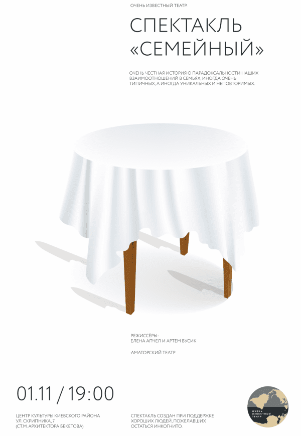 «Очень Известный Театр»: премьера спектакля «Семейный» відбудеться 1 листопада 2017, 19:00, середа в Муніципальний центр культурних ініціатив (ПК Зв'язку). За допомогою сервісу internet-bilet.ua, Ви зможете з легкістю забронювати, замовити та купити квитки на концерт, спектакль, оперу, балет, майстер-класи, спортивні та дитячі заходи, що Вас цікавлять, оплативши їх найбільш зручним для Вас способом: через інтернет банківською карткою VISA/MasterCard, готівкою або кур'єром, якщо зробите замовлення квитка з доставкою.