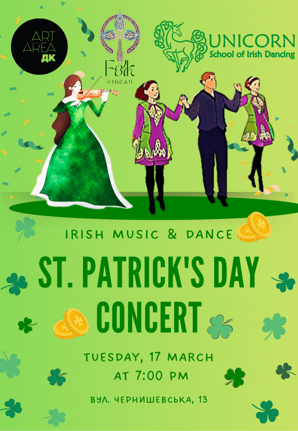 Концерт до Дня Святого Патріка відбудеться 17 березня 2026, 19:00, вівторок в Art-Area ДК. За допомогою сервісу internet-bilet.ua, Ви зможете з легкістю забронювати, замовити та купити квитки на концерт, спектакль, оперу, балет, майстер-класи, спортивні та дитячі заходи, що Вас цікавлять, оплативши їх найбільш зручним для Вас способом: через інтернет банківською карткою VISA/MasterCard, готівкою або кур'єром, якщо зробите замовлення квитка з доставкою.
