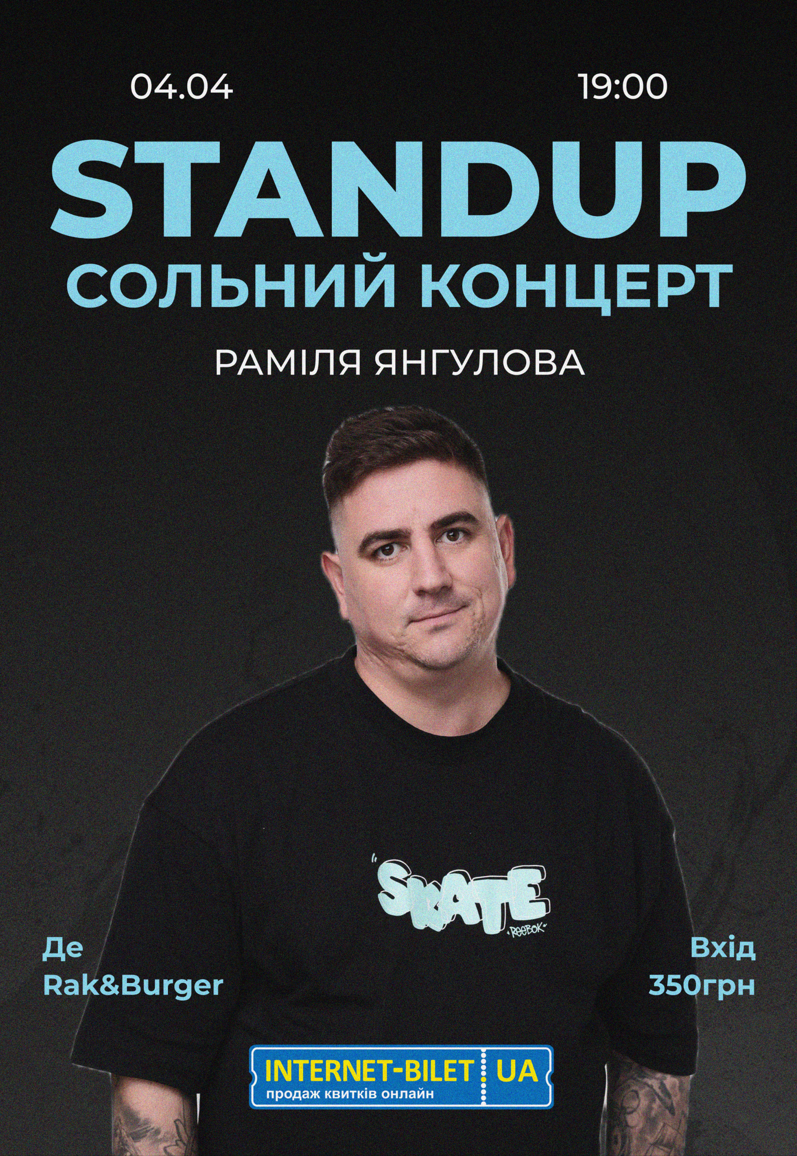 Сольний stand up Раміля Янгулова відбудеться 4 квітня 2026, 19:00, субота в Бар "Rak & Burger". За допомогою сервісу internet-bilet.ua, Ви зможете з легкістю забронювати, замовити та купити квитки на концерт, спектакль, оперу, балет, майстер-класи, спортивні та дитячі заходи, що Вас цікавлять, оплативши їх найбільш зручним для Вас способом: через інтернет банківською карткою VISA/MasterCard, готівкою або кур'єром, якщо зробите замовлення квитка з доставкою.